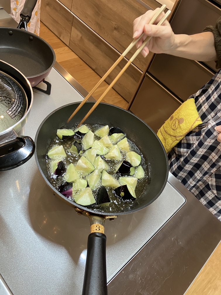 初めに野菜を切り、茄子を温度調節機能を使い、揚げました。