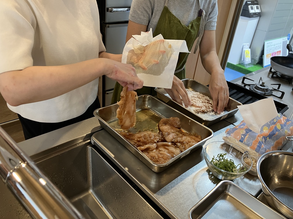 参加者の方にはボタン操作や炒めたり、混ぜたり、衣をつけたりと簡単な作業をしていただきました。