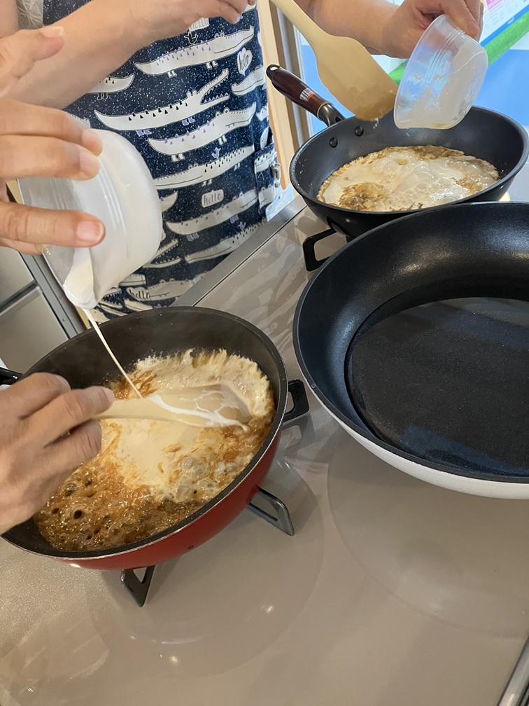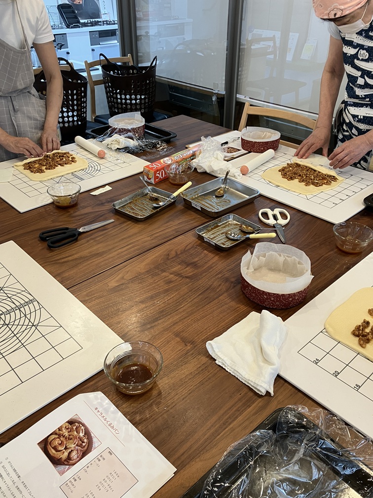 一次発酵中にキャラメルソースを作り、ナッツをからめました。