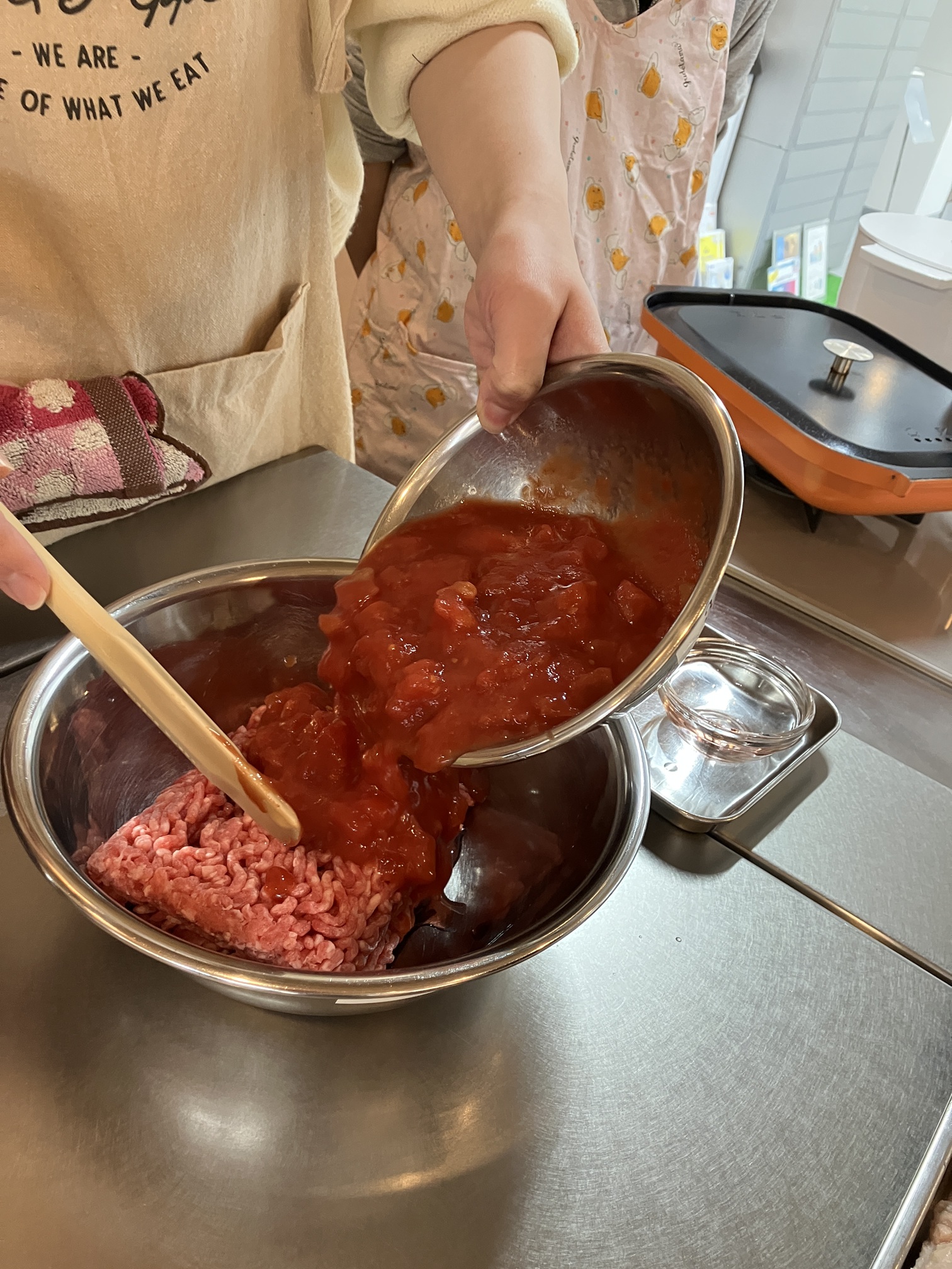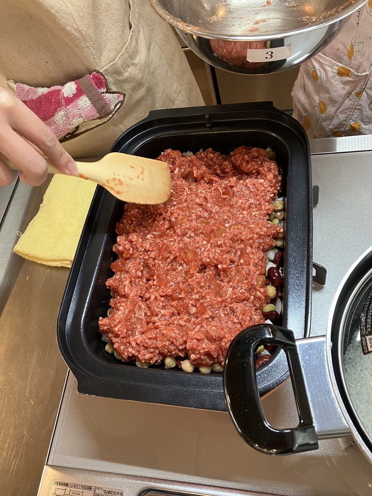 初めに合いびき肉に調味料を合わせ、グリル専用鍋に玉ねぎ、ミックスビーンズ、合いびき肉の順に入れ、煮込みました。