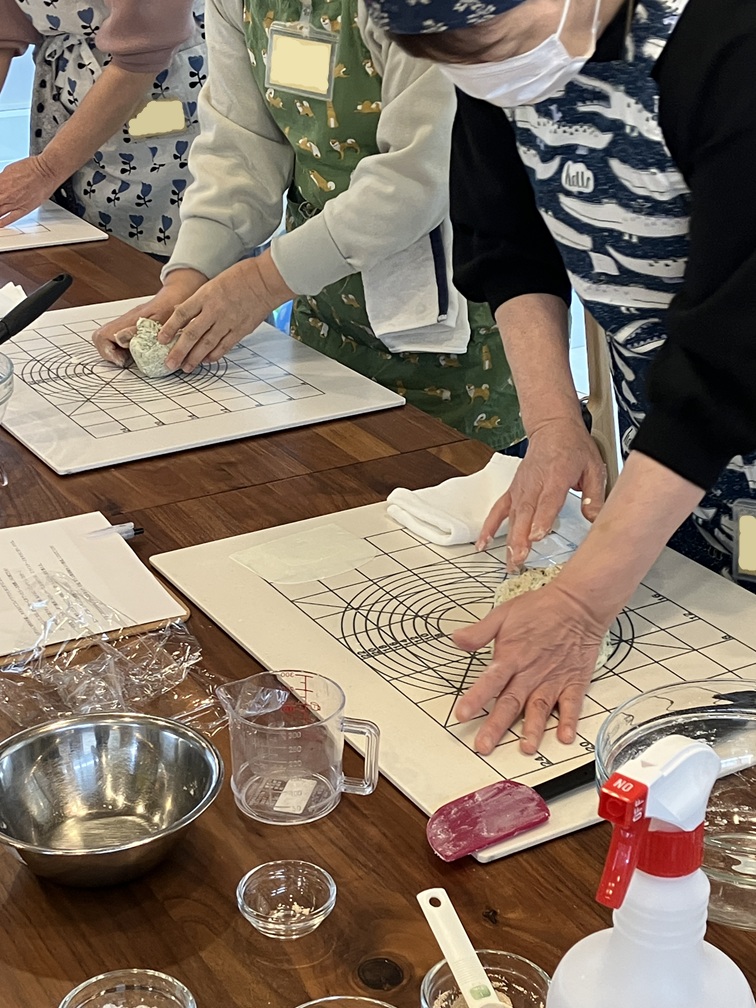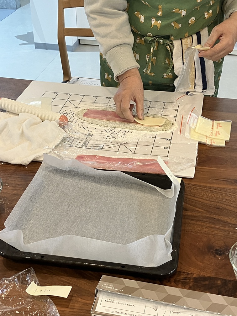 発酵が終わったら、成形です。ベーコンとチーズを入れて巻きました。