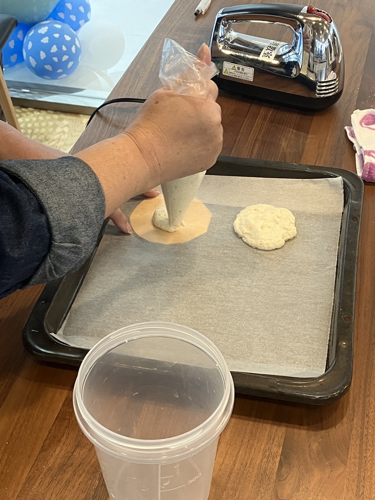 ビスキュイ生地が焼けて、冷めたらクリームを絞りトッピングしていきます。