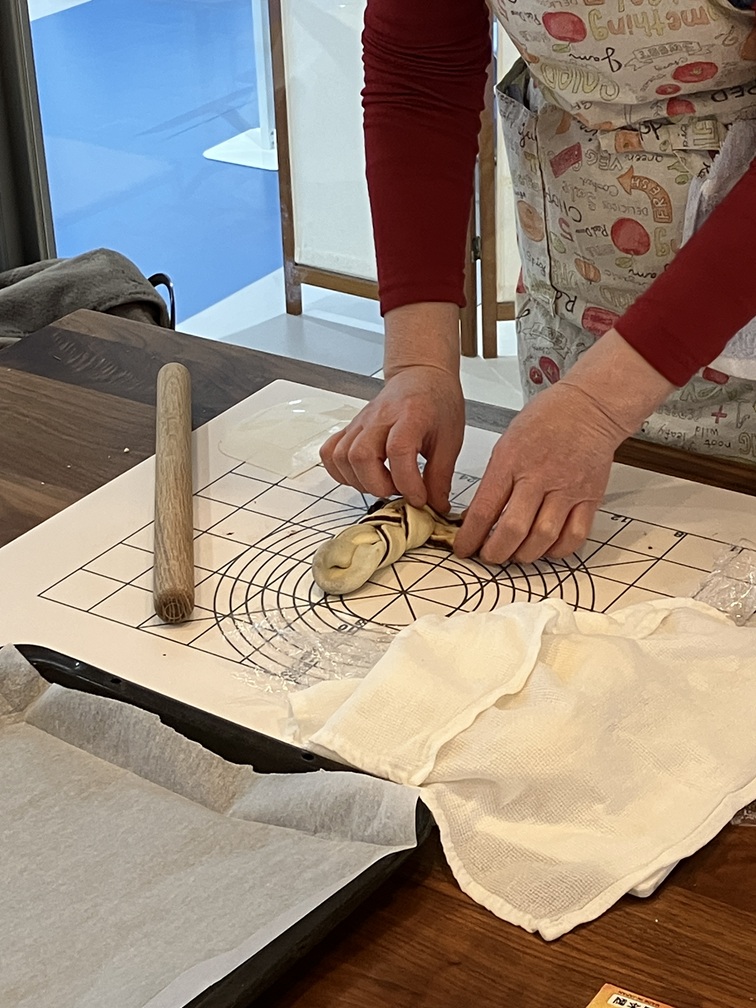 発酵が終わったら成形です。生地にあんを包み、伸ばして編み込みました。